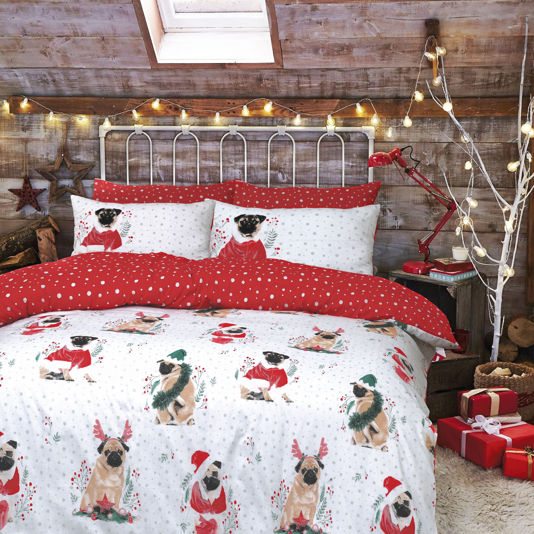 Festive Pugs Single Duvet Set Adorable festive pug print design Soft, smooth and easy-care fabric Perfect for adding Christmas cheer Durable, comfortable and quick-drying High-quality bedding at great value Composition: 52% Polyester, 48% Cotton
