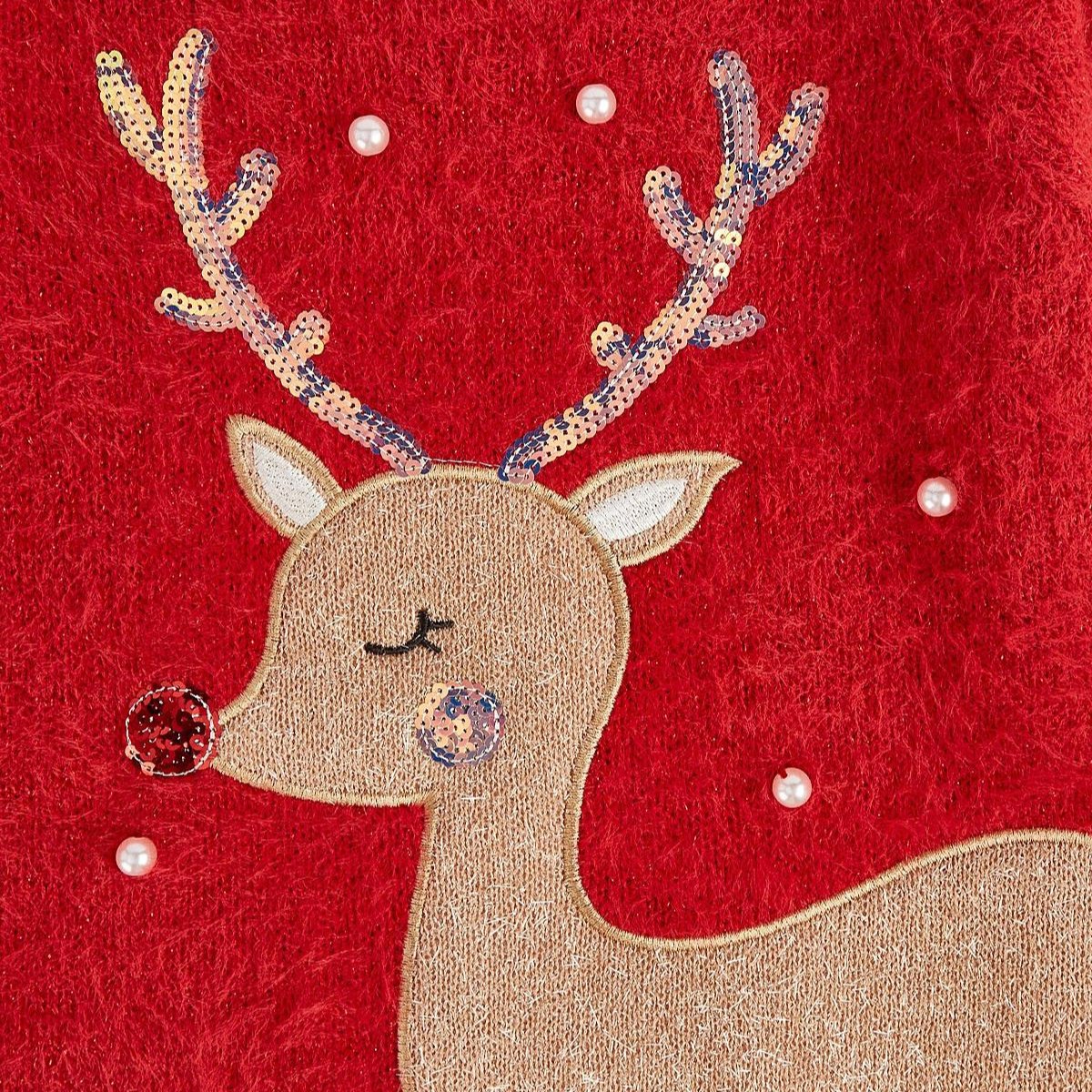 This Reindeer Jumper will have your little ones ready for the festive season! It's made of soft fluffy fabric complete with a charming reindeer applique, with added sequins and pearlescent embellishments. The long balloon sleeves add an extra 'fluffy' flourish, perfect for Christmas fun. Ho, ho, ho!