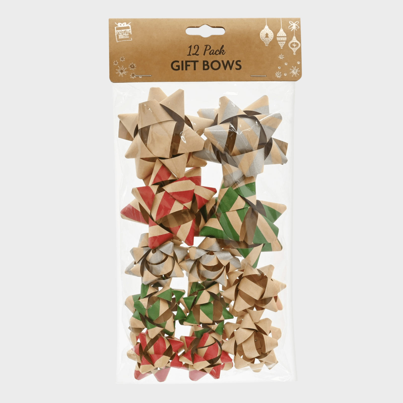 Kraft paper gift bows 7.5cm 12pc asst. A simple and stylish way to finish off presents, this pack contains 12 kraft paper gift bows, each measuring 7.5cm, perfect for adding a natural and rustic touch to your wrapping. Lightweight and easy to apply, they stick securely to boxes, gift bags or wrapping paper, creating a polished and charming look. Ideal for birthdays, Christmas, weddings or any special occasion, the neutral kraft design complements a variety of colours and styles. As a cut label product, they provide the same quality for less, helping you save money while giving your gifts an attractive finishing touch.