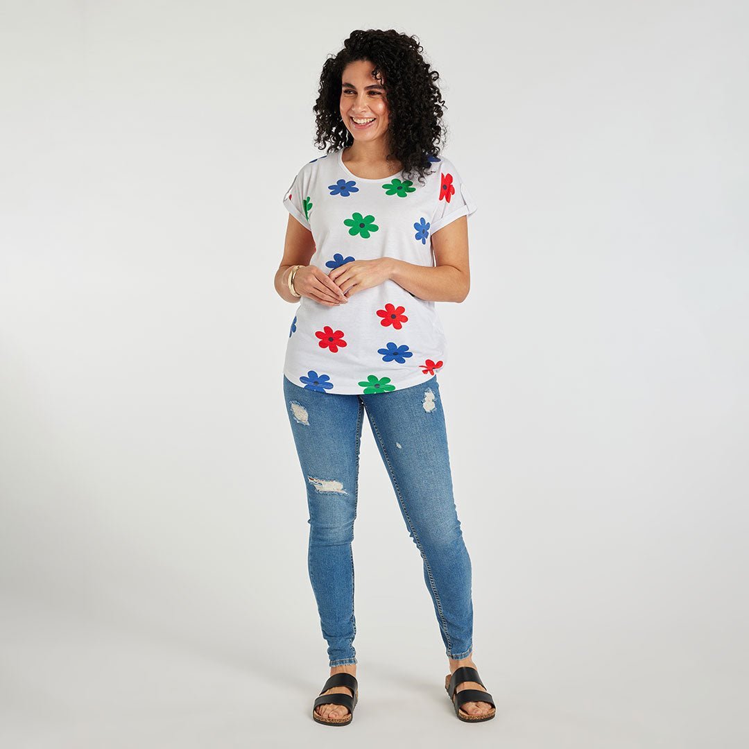 Revamp your wardrobe with this versatile and trendy t-shirt that combines comfort and fashion. The colourful flower print adds a feminine touch to your ensemble, making it perfect for any casual occasion.