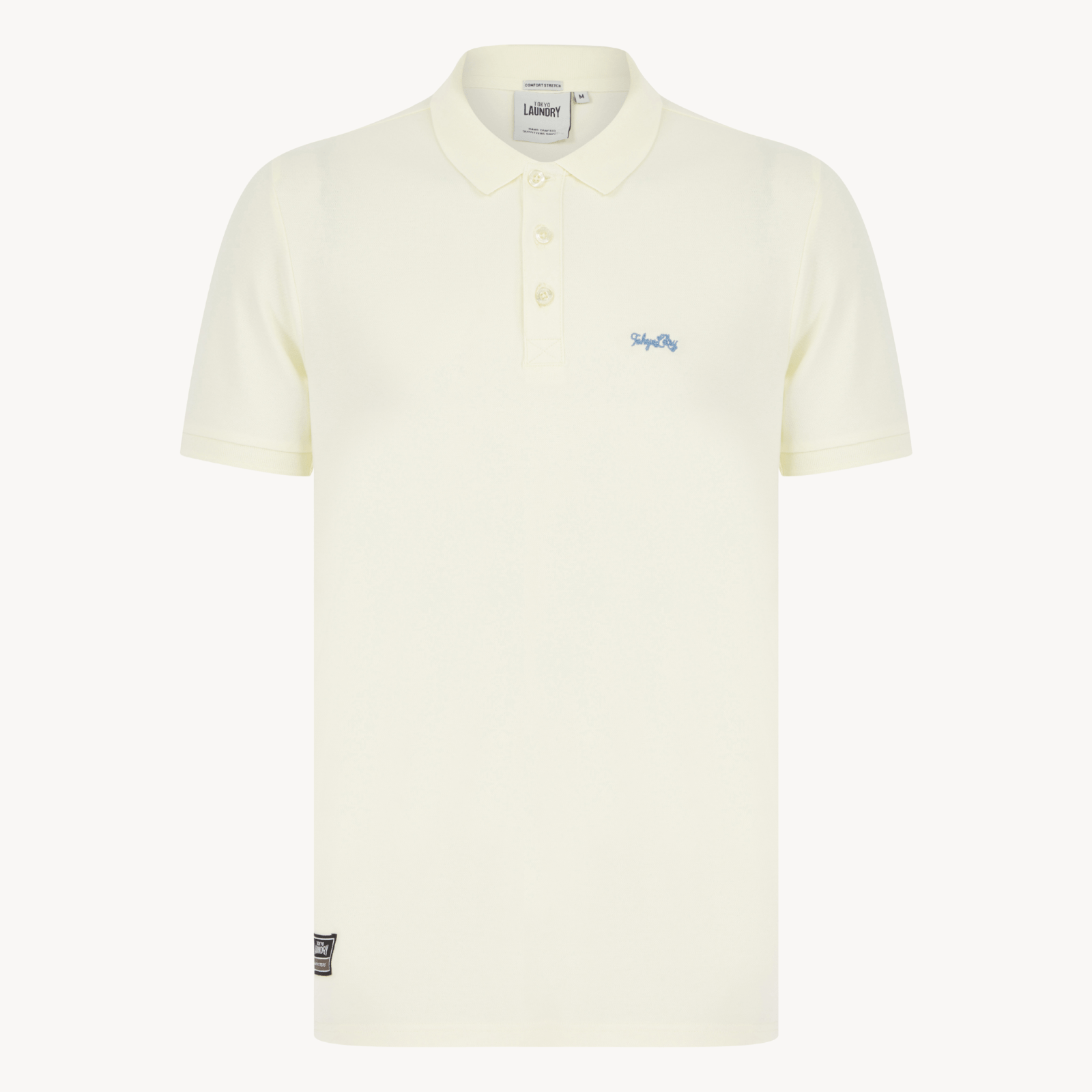 Designed with a button placket, chest embroidery, and a woven hem badge, it balances clean style with subtle detailing for a sharp, everyday look.